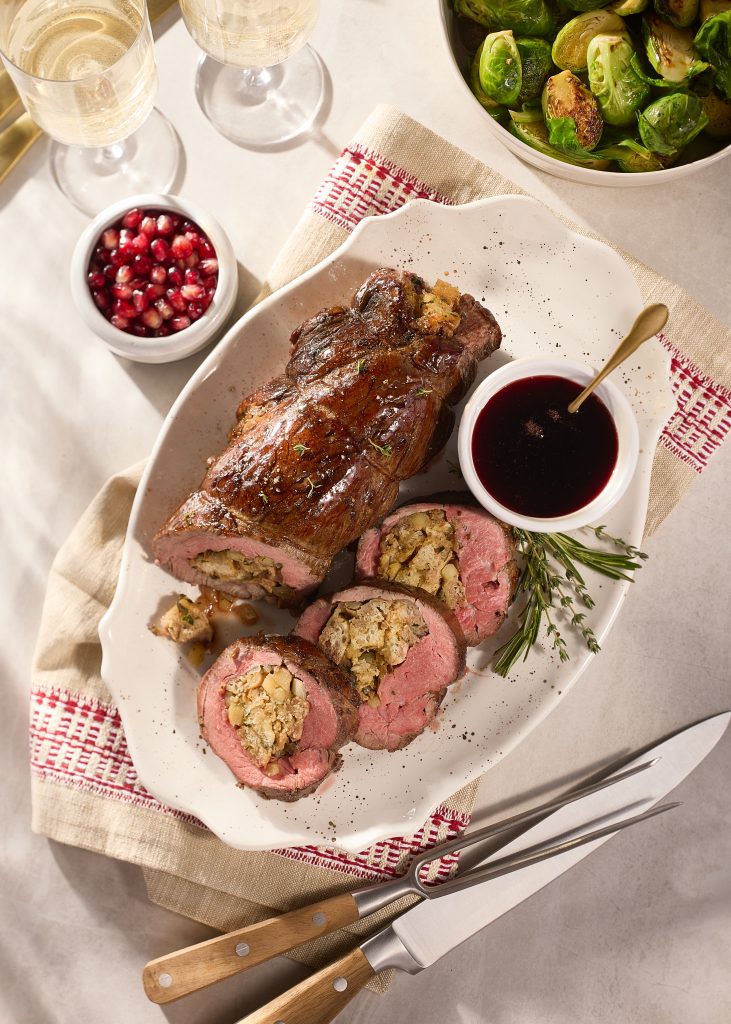 Cut tenderloins almost in half lengthwise, so it opens like a book; pound to flatten slightly. Spread and lightly pack stuffing down the centre, leaving 1” border from the edges. Fold long edges over stuffing overlapping as necessary, and fold in the narrow end; secure with skewers or string.
