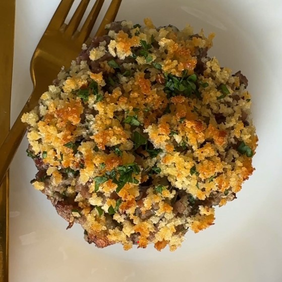 Heat a large skillet over medium-high heat. When the skillet is hot, add the ground veal and cook for 4-5 minutes while breaking it apart using a spatula. Stir in the minced shallots and garlic, lightly season with salt and pepper, and cook just until the meat is no longer pink. Carefully transfer the mixture to a heatproof bowl and stir in dried cranberries, dried sage and chili flakes. Allow the mixture to cool for 20 minutes, stirring occasionally. Next, stir in the bleu benedictin, cream cheese, and chopped parsley. In a small bowl, combine panko and extra virgin olive oil. Generously fill mushroom caps with the veal mixture and pack it into place, then transfer to the parchment-lined baking sheet. Top each filled mushroom cap wth the panko mixture. Bake for 20 minutes, until the panko is golden and the cheese is oozy. To serve, garnish with additional chopped parsley, and enjoy!
